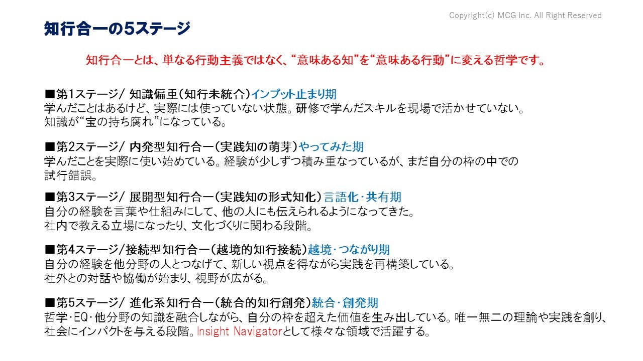 知識が行動に移される「萌芽期」から、経験が言語化される「展開期」、他者と接続し始める「越境期」、そして知の統合と創発が起こる「進化期」へ。それぞれのステージは、単なるレベルではなく、内的成熟と外的貢献の旅路です。そして、この旅の最高峰に位置するのが「Insight Navigator」